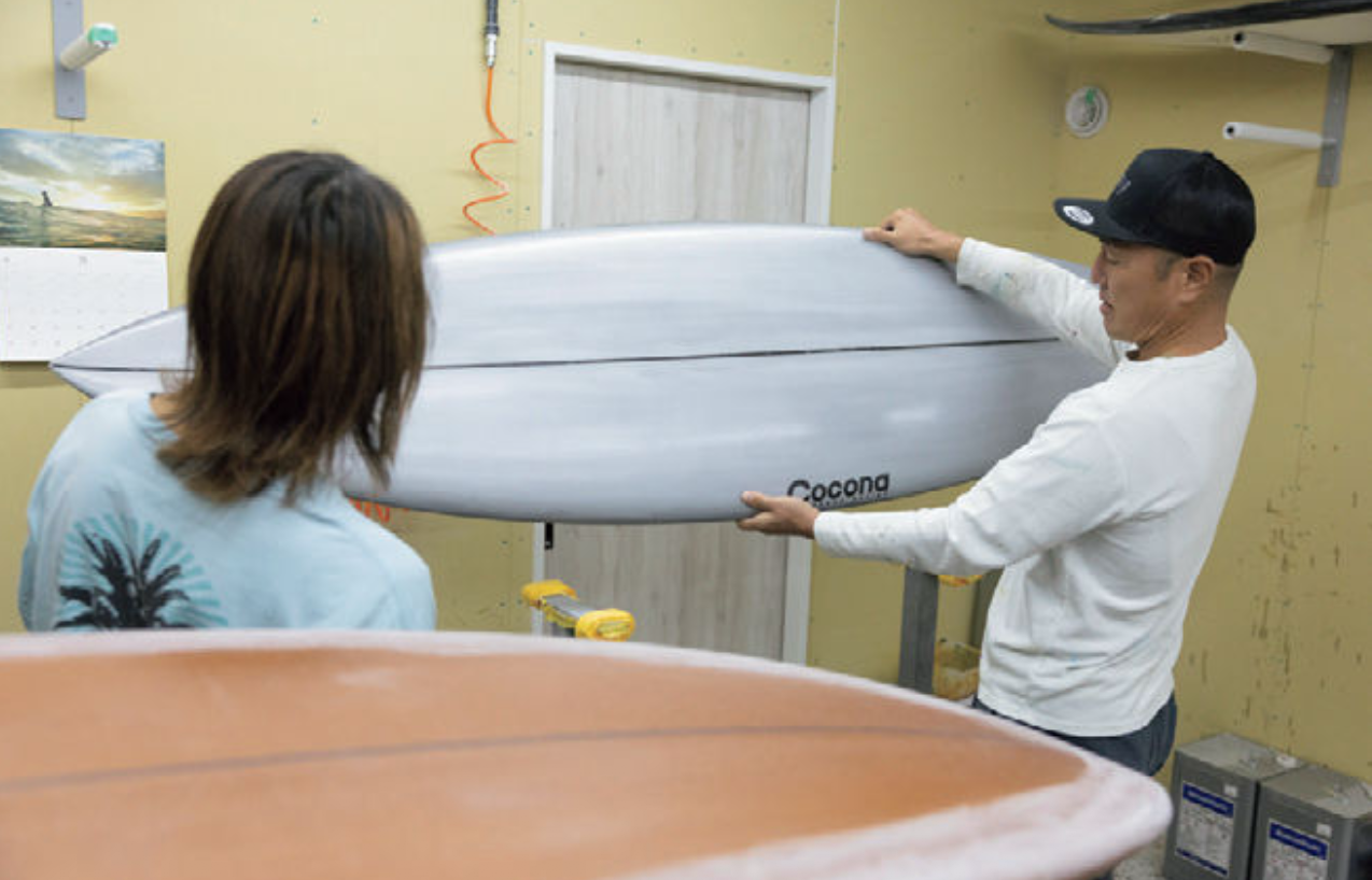 川瀬が自身のブランド「COCONA SHAPES」を立ち上げたのは、2025年。ON SURFBOARDSの工場で仕事を続けながら、3つのモデルを発表している。ショートボードの「20-20」、ツインフィッシュの「Speedy’s」、そしてミッドレングスの「Trucks」。いずれも川瀬自身の感覚、アイデアをもとに設計され、テストを繰り返して仕上げられたボードだ。川瀬に各ボードの特徴を語ってもらった。「『20-20』はスピードを保ちながらトップまで伸びていってくれるショートボード。『Speedy’s』はツイン特有の伸びのあるターンを活かし、波を選ばずに楽しめるオールラウンどな設計。『Trucks』は緩い波でのクルージングを想定し、初心者から中級者へのステップアップに対応するミッドレングスです」。それぞれのモデルはON SURFBOARDS の工場で製作され、最終仕上げを逢野が確認したうえでリリースされる。販売によって得た収益は、川瀬の海外遠征費など競技活動の資金に充てられる。スポンサーからの支援に頼るだけでなく、自分の手で作ったボードを通して活動を支える仕組みだ。この流れは、近年の国内クラフト業界における新しいロールモデルとなるかもしれない。ファンがボードを購入することで、選手を直接支援するという形は、従来の企業スポンサーとは異なる温度感を持つ。作り手と乗り手、そして応援する人々が同じ輪の中にいるそんな関係性を生み出せるのではないか。サーフセッションを終え工場では、川瀬が自身のブランド「COCONA SHAPES」のボードを仕上げている。マシーンでカットされたブランクスをサンディングペーパーで整え、レールを滑らかに仕上げていく。逢野はハンドシェイプもマシーンシェイプもこなすクラフツマンだが、川瀬はまだマシーンシェイプのみ。将来的にはハンドシェイプからグラスワークまで自分の手で行えるようになりたいという。取材を行った日もすでに3本のボードがグラッシングされている最中だった。なかには川瀬本人がグレーのステインカラーを施した1本もあり、今後もシェイピング以外にも様々なことにチャレンジしていくという。