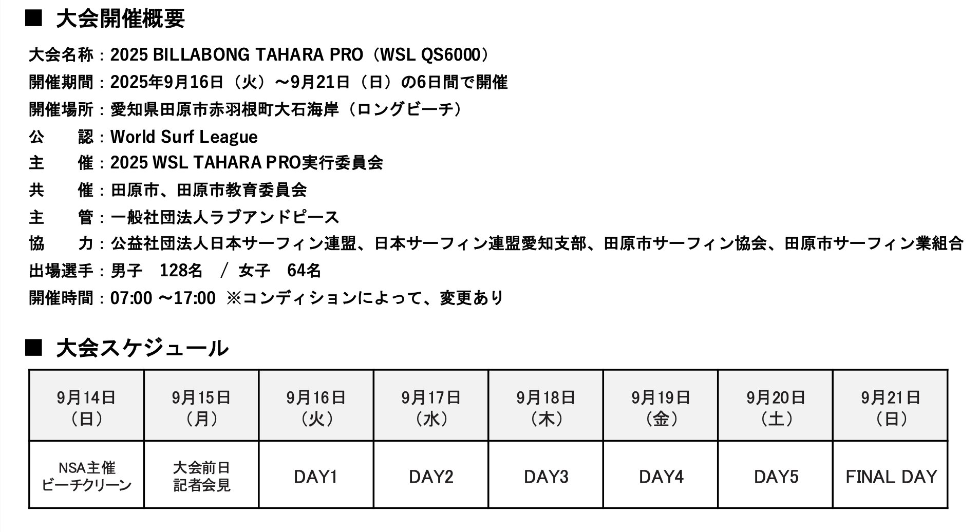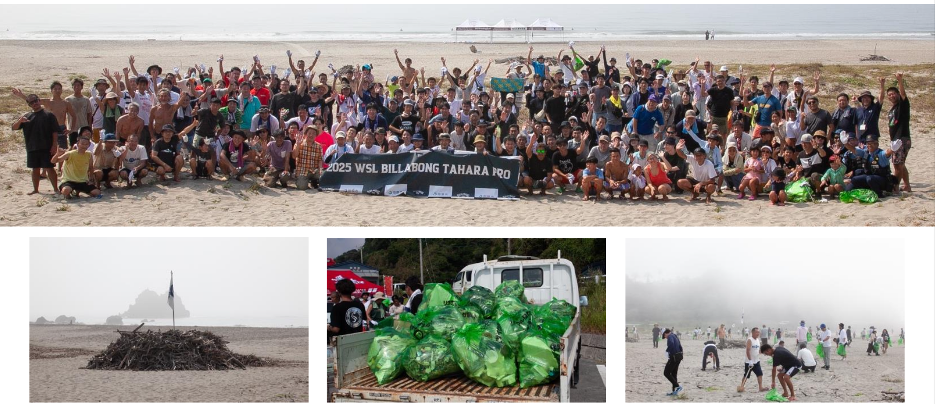 2025年9月16日(火)から9月21日(日)の6日間にわたり、愛知県⽥原市⾚羽根町⼤⽯海岸において開催される「2025 BILLABONG TAHARA PRO」。世界各国から訪れる選手がこの⼤会会場で気持ちよく最高のパフォーマンスを発揮できるよう、市民の皆さんをはじめ、地元企業や各種関係団体の皆様が参加し、ビーチクリーンを8月24日(日)に開催し、多くの流木や漂着したゴミなどを集めた。