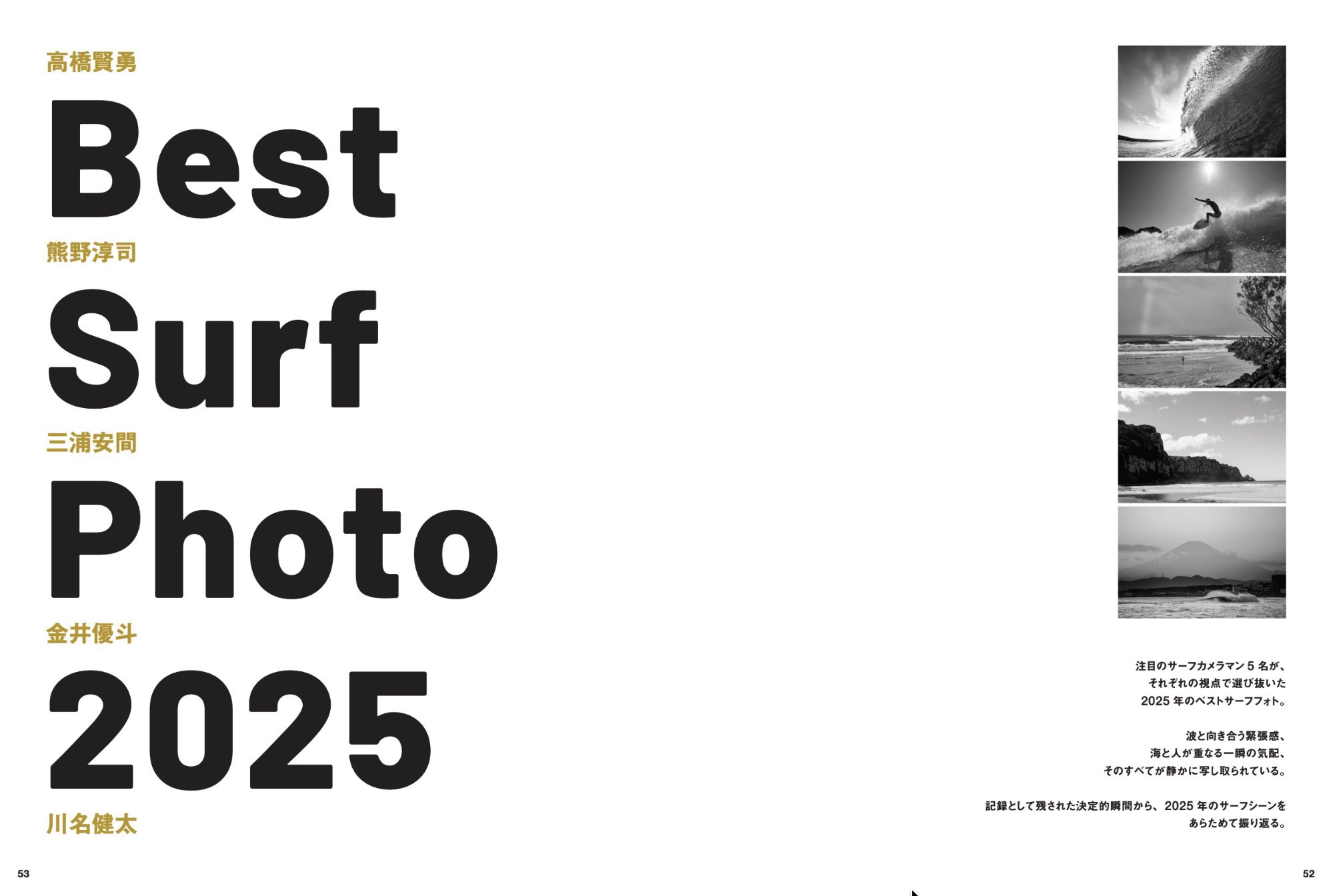 高橋賢勇/熊野淳司/三浦安間/金井優斗/川名健太、注目のサーフカメラマン5 名が、それぞれの視点で選び抜いた2025 年のベストサーフフォト。波と向き合う緊張感、海と人が重なる一瞬の気配、そのすべてが静かに写し取られている。記録として残された決定的瞬間から、2025 年のサーフシーンをあらためて振り返る。